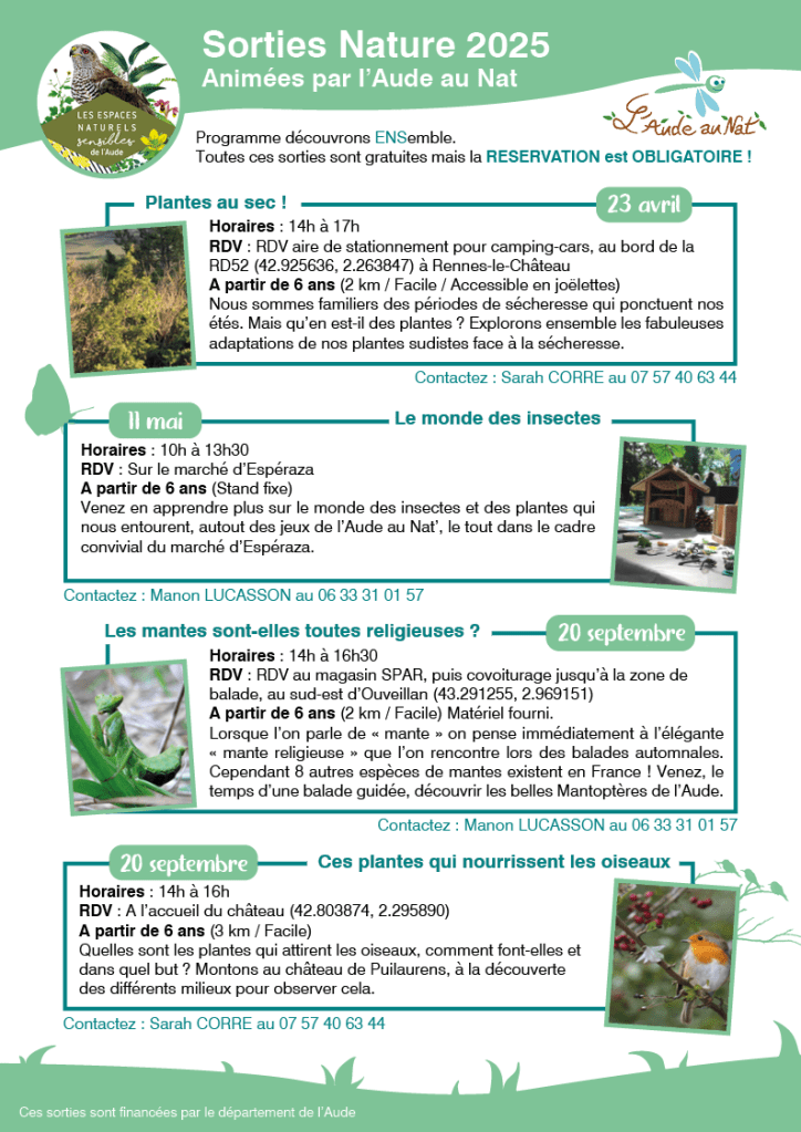 | Programme ENS 2025 | https://www.aude.fr/ensemble-decouvrons-les-espaces-naturels-sensibles |